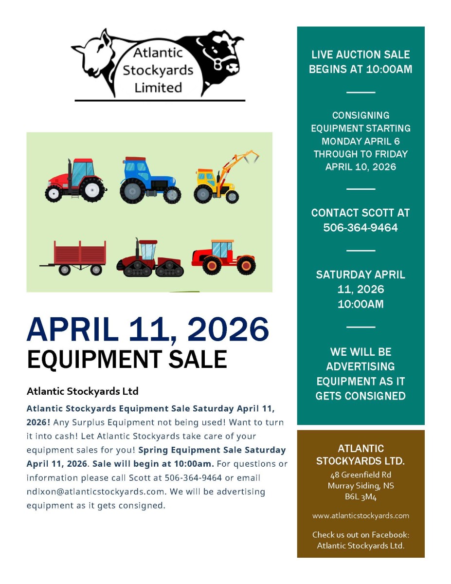 Atlantic Stockyards Ltd Spring 2026 Feeder Sales. Feeder Sale Tuesday April 7, 2026. Sale will begin at 10:00am on Tuesday April 7, 2026. Cattle will be accepted at Atlantic Stockyards on Monday April 6, 2026. Please find Atlantic Stockyards vaccine form along with vaccine protocol and requirements for selling vaccinated cattle on the forms page on our website. Please send vaccine forms and veterinarian receipt as proof of vaccine purchase to ndixon@atlanticstockyards.com. If you have any questions call Scott at 506-364-9464.